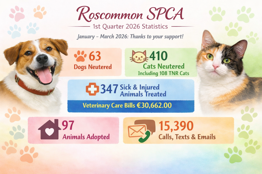 As spring begins, we’re proud to share Roscommon SPCA’s first‑quarter results for 2026 — a reflection of the kindness and dedication that keep our work going. Every rescue, every adoption, and every call answered is powered by volunteers and supported by people like you. Thank you for helping us make a difference for animals across Roscommon.