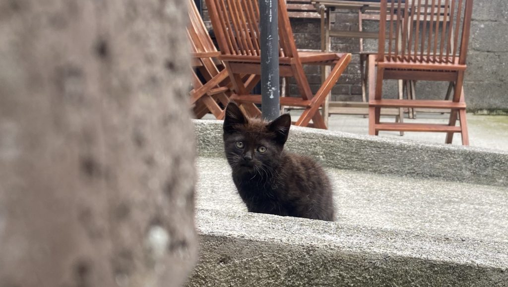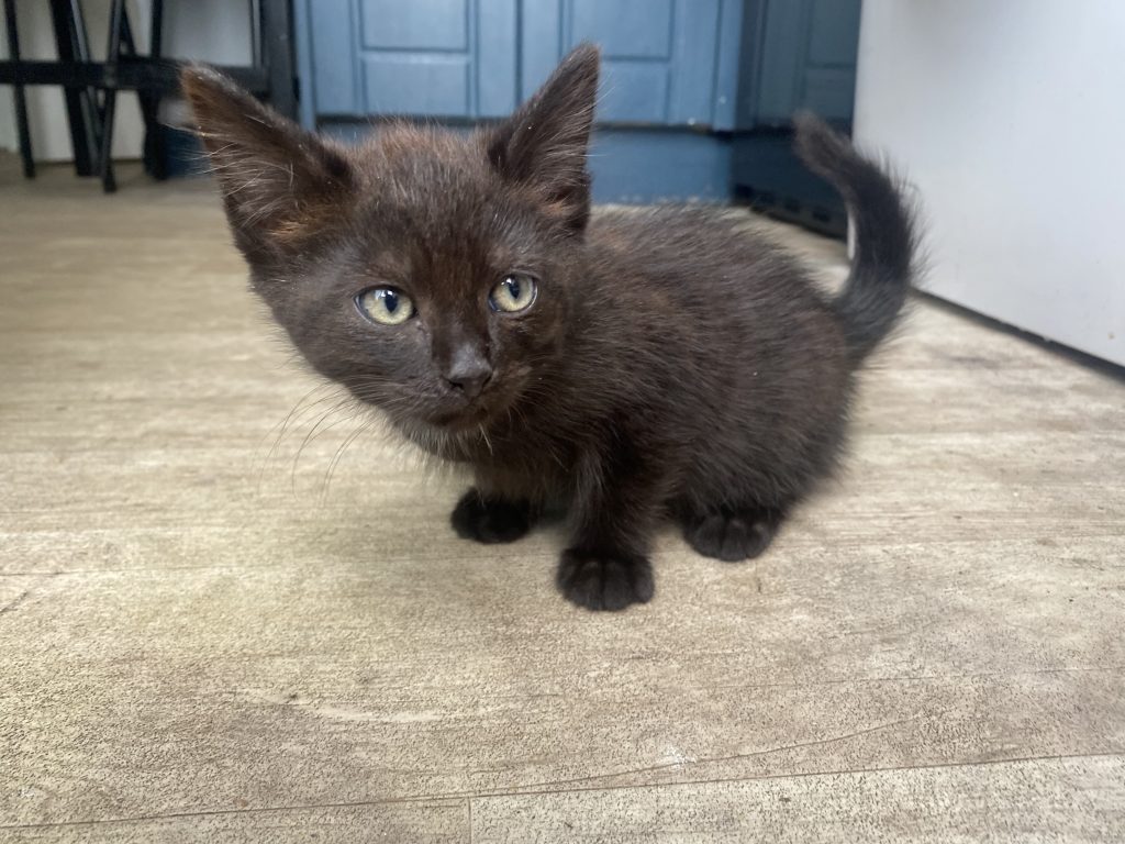This spirited ten-week-old female kitten is full of character—boisterous yet independent. She is litter trained and comfortable around people, though she marches to the beat of her own drum. With a playful streak and a solitary nature, she is perfect for someone who appreciates a kitten with personality and a touch of mystery.