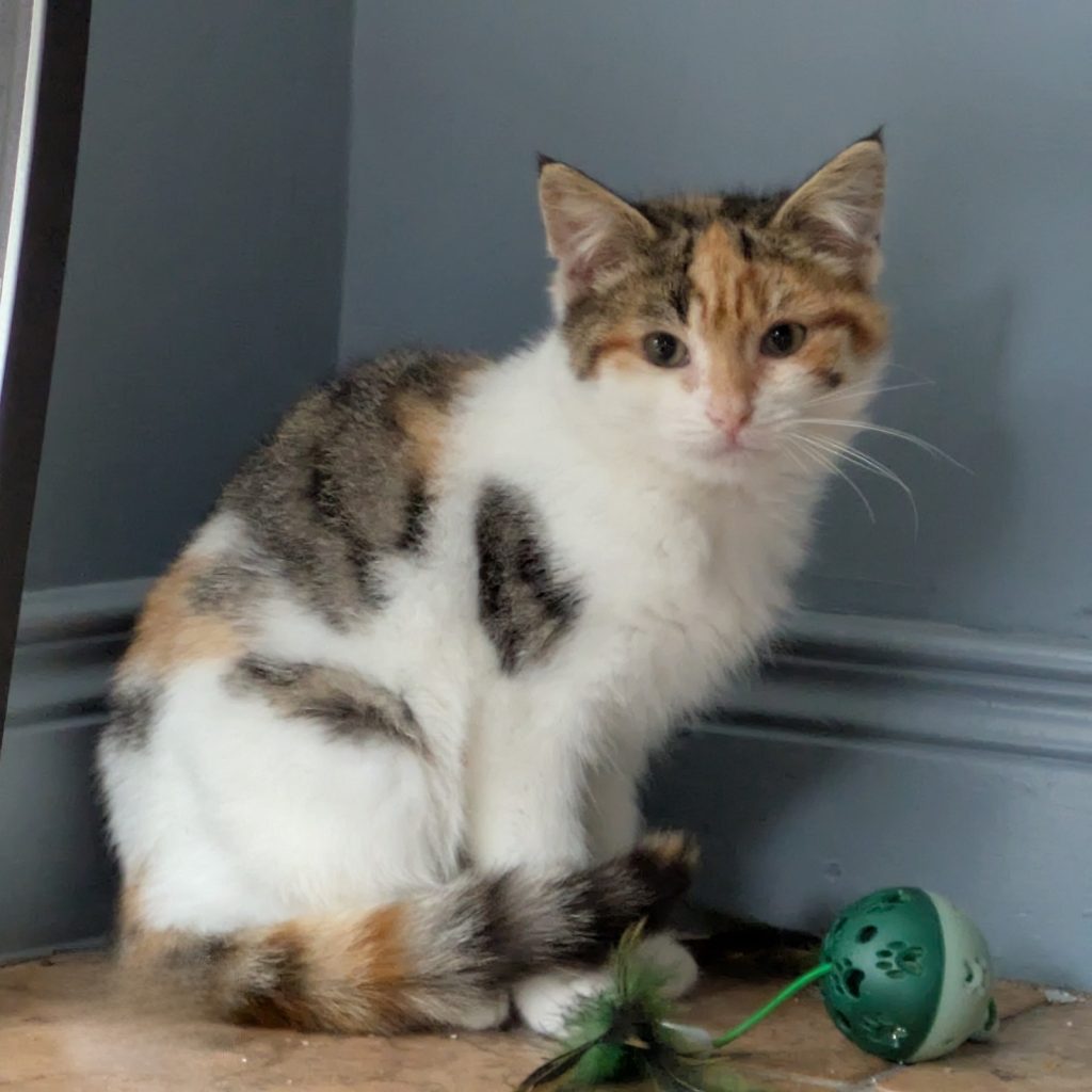 Charlie is a gentle 9-week-old female kitten who’s a little shy around people but absolutely loves snuggling with her fellow cats. Full of playful energy and fully litter trained, she would flourish in a peaceful home—especially one that includes a calm cat companion to help her feel safe and loved.