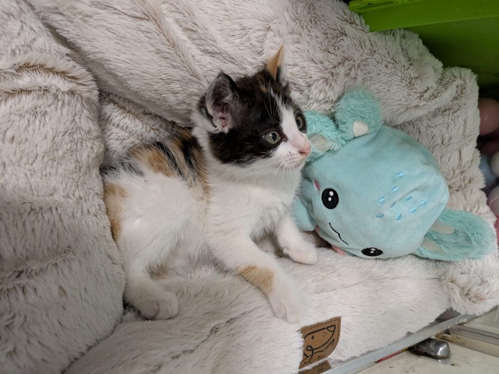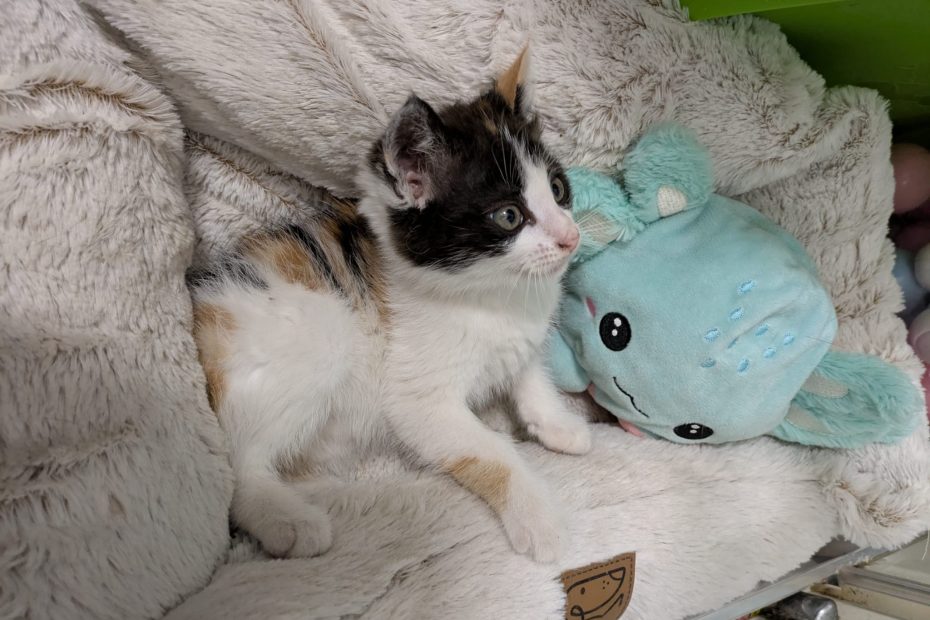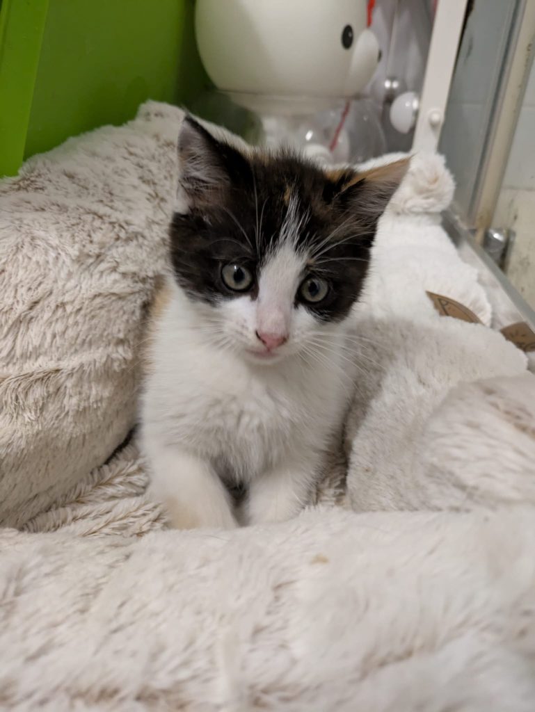 This lovely eight-week-old female Calico kitten is looking for a forever home. Very friendly and using litter tray.